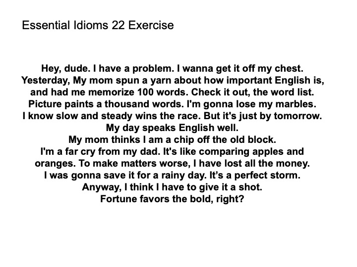 (Example) Essential idioms 22 Exercise Tin liên quan Essential Idioms 1 Essential idioms 2 Essential idioms 3 Essential idioms 4 Essential idioms 5 Essential idioms 6 Essential idioms 7 Essential idioms 8 First1234End